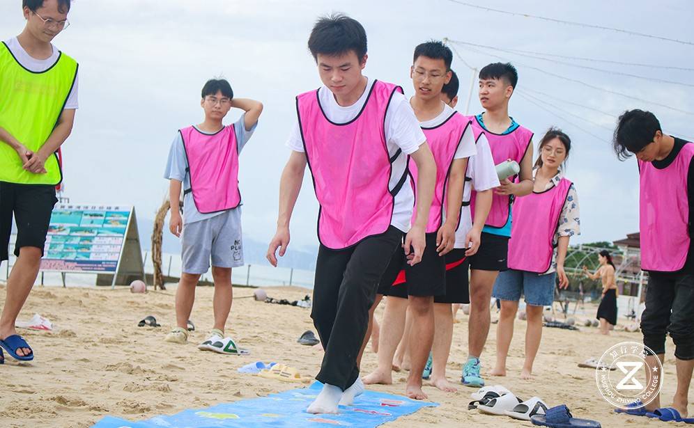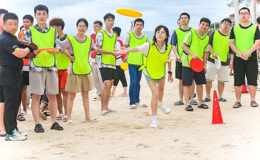 第二天我们来到巽寮湾金色沙滩拓展基地,活动刚开始主教练用一个简单的热身让伙伴们拉伸身体,活跃气氛,为接下来的极限飞盘做准备。