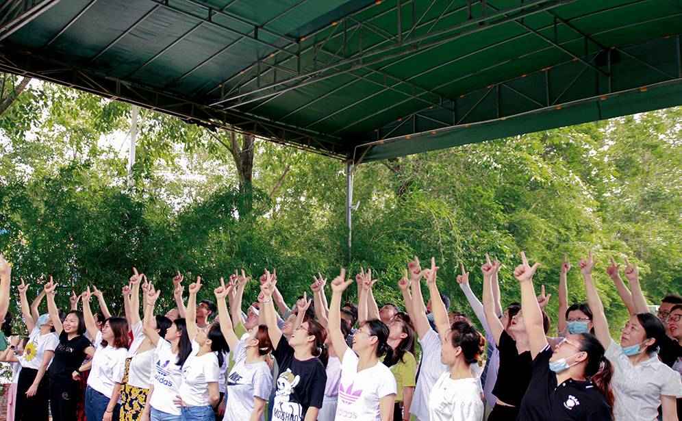 通过各小组的练习,不断的磨合,优化,调整,终于让不可能变成了可能!一上午的时间转瞬即逝,大家暂时停战,补充能量,吃完午餐后,天公作美,降下一场甘霖,带起了一丝丝凉意,舒缓了经过一上午的炎热身心,主题活动前教练带领大家来了一段午间按摩操,让大家的困顿一抄而空,血量回升,激情满满,